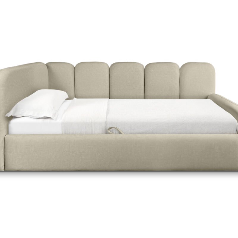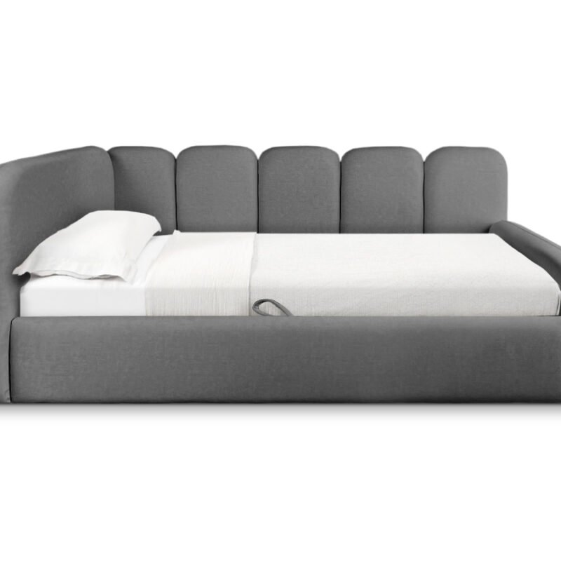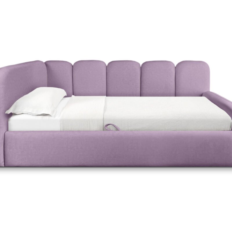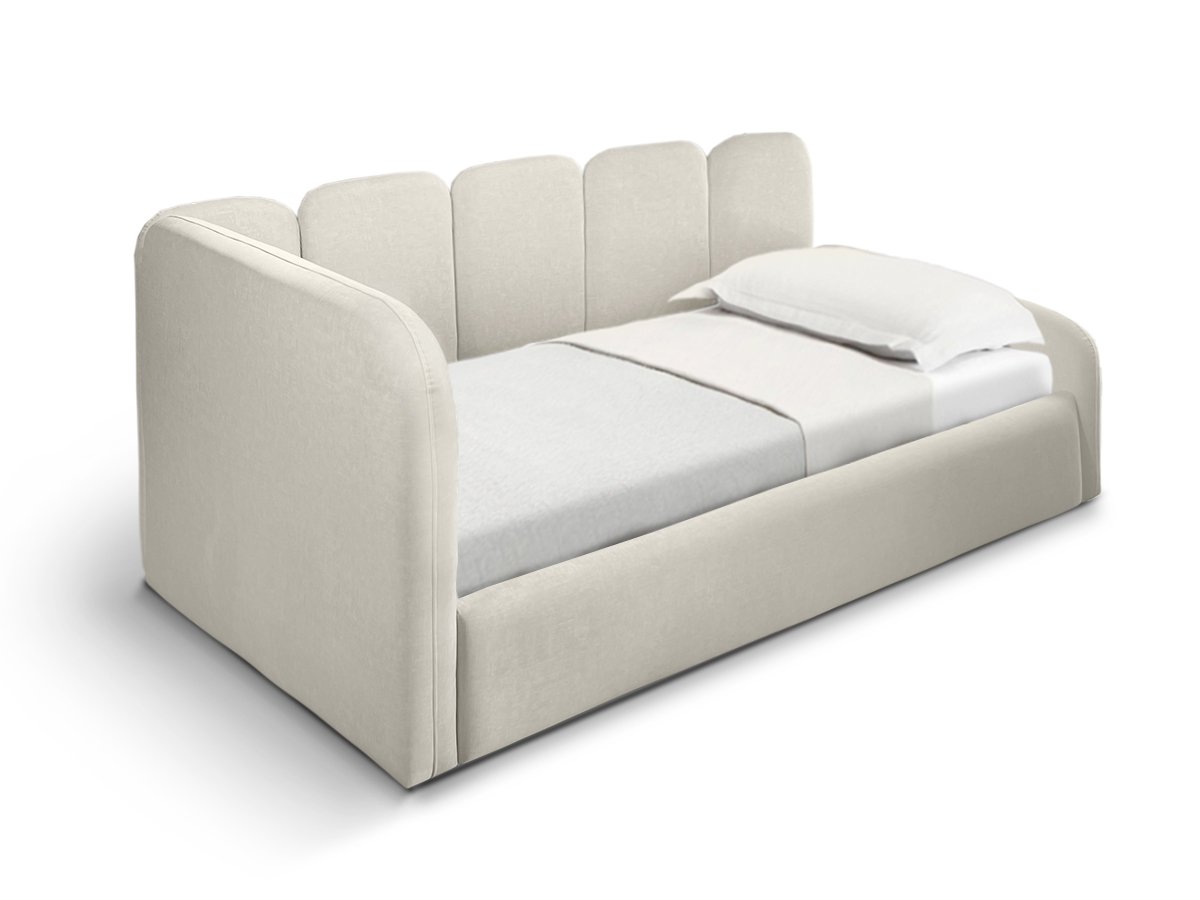Das Einzelbett TINY eignet sich ideal für moderne Interieurs und schafft eine gemütliche Atmosphäre. Die weich gepolsterten Seitenteile und ein praktischer Bettkasten sorgen für maximalen Komfort und zusätzlichen Stauraum.