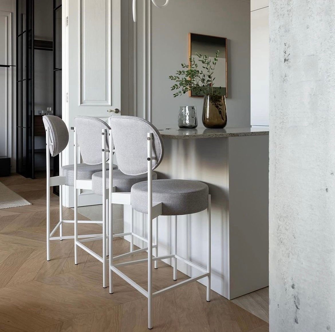 Barhocker mit Metallgestell und weichen Formen