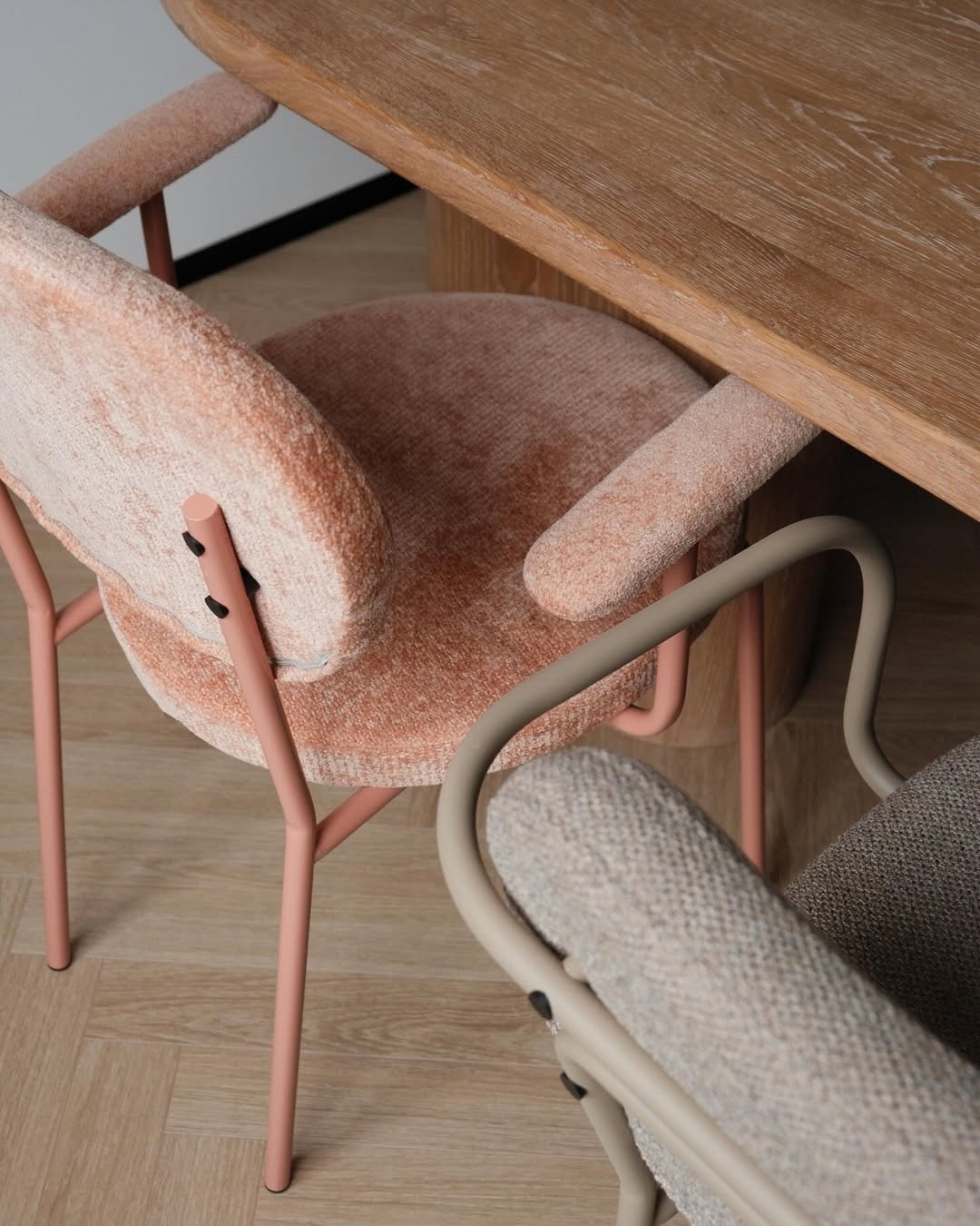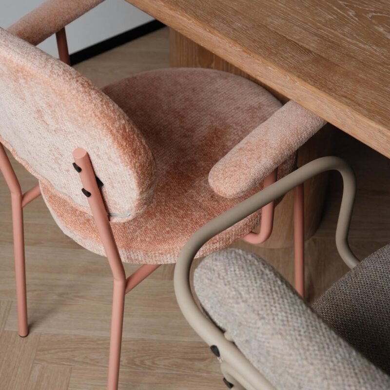 Eine Reihe niedlicher Stühle aus Metall, Sperrholz und Textilien.